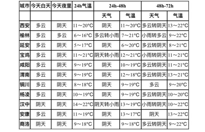 11日:陕北多云间晴天,关中、陕南多云间阴天。