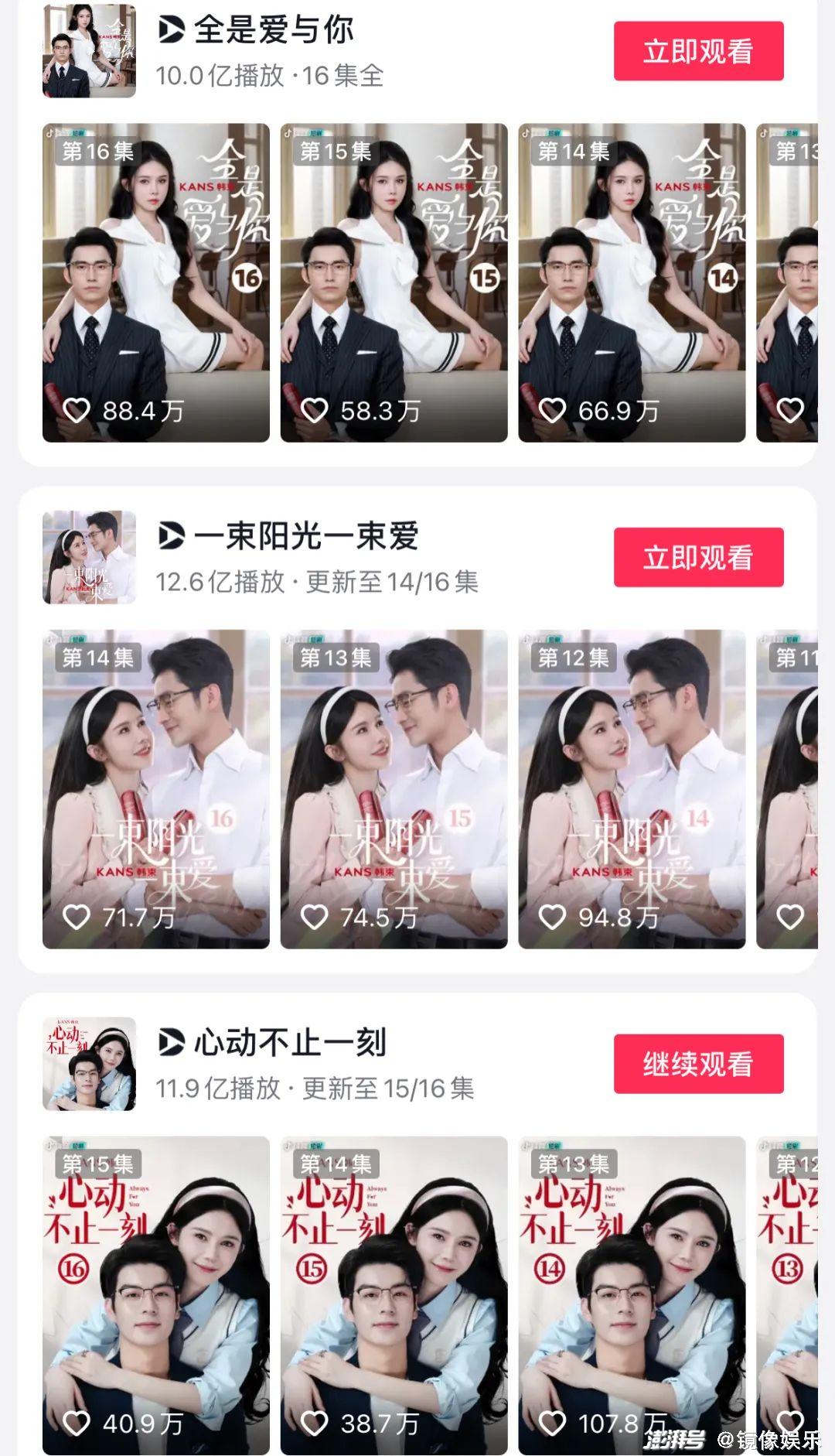 尝到微短剧营销的甜头后,韩束便一发不可收拾,之后又接连与姜十七合作了《心动不止一刻》《一束阳光一束爱》《全是爱与你》《你终将会红》四部微短剧,四部剧集市场表现都超越了《以成长来装束》,单部播放量破10亿,累计播放量达到44.6亿。算上《以成长来装束》,韩束成功靠五部微短剧撬动了50亿的流量。