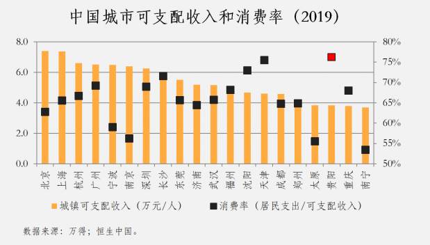 贵阳长期的城市竞争力很难再依赖投资,恐怕要转而关注收入、消费和生活质量的提高。当地居民的消费意愿强劲是有目共睹的,尽管原因有些费解。在全国相似收入水平的城市中,贵阳居民消费倾向排第一。当地相对低的房价可能是个原因——这使得当地人能承受更多的生活消费。持续的人口流入可能是另一个动力---因为实证表明,外来人口的消费总要高于原住民人口,因为他们通常较年轻,消费意愿强。基于此,当地的收入提高带来的消费拉动因此更加明显,中高端消费有潜力。