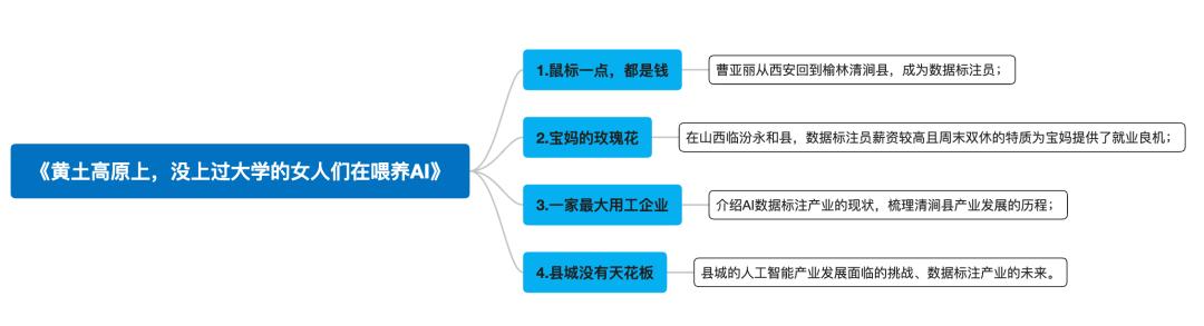 A:我采访之前都不会想逻辑,但是会明确要搞清楚哪些问题,比如说为什么女性比例高,为什么数据标注产业会出现在黄土高原,又为什么可以成功发展下去。在写之前才知道按照什么样的结构,但是在我离开之前,会确保弄清楚这几个大问题。
