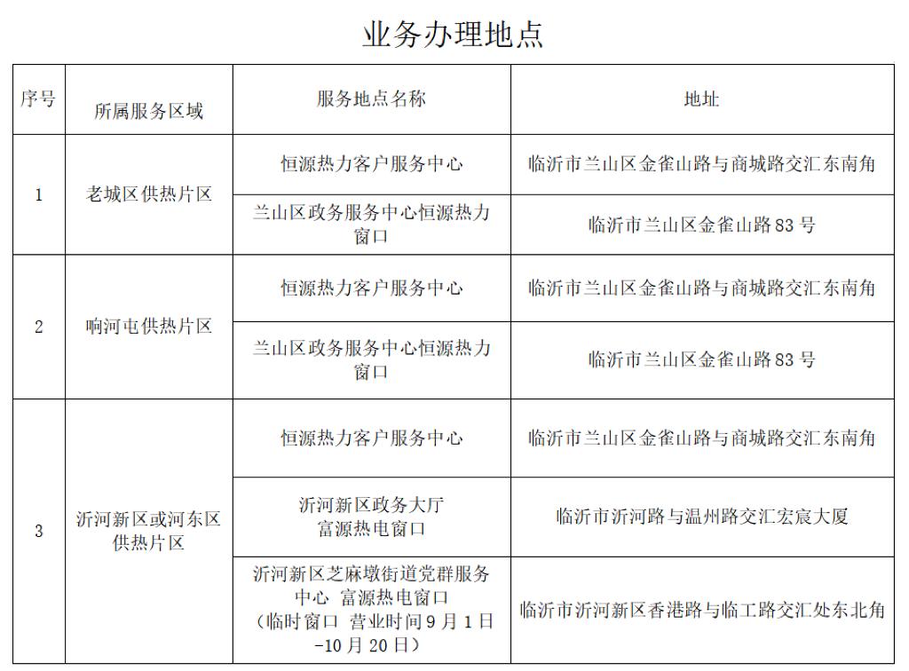 2.线下缴费:老城区及响河屯用户可到恒源热力客户服务中心、兰山区政务服务中心恒源热力窗口缴费,或就近到浦发银行窗口缴费。沂河新区用户可到沂河新区政务大厅富源热电窗口、沂河新区芝麻墩街道党群服务中心富源热电窗口(临时窗口 营业时间9月1日-10月20日)缴费。