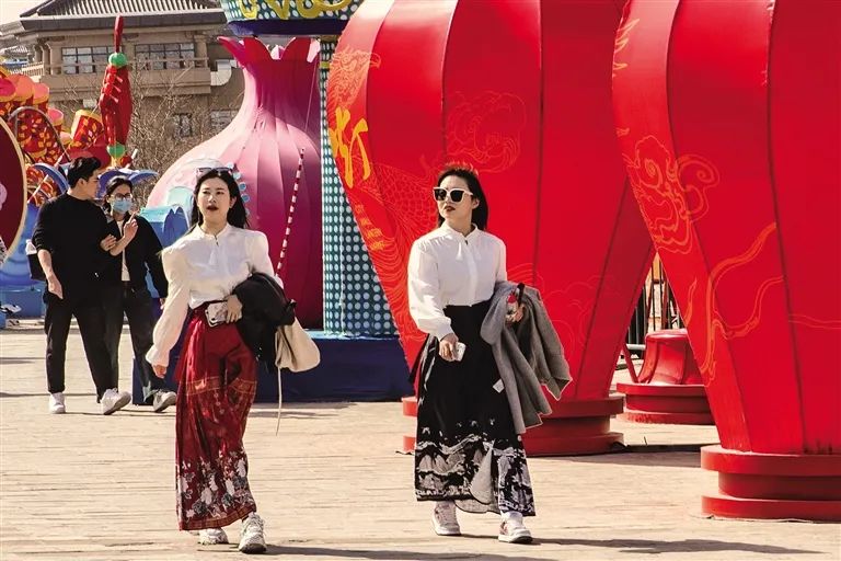 在西安市大唐不夜城,不少年轻人穿着带有盘扣、扎染、立领、云纹等中式元素的衣服游览、拍照,吸引了众多游客的目光。身着白色盘扣衬衫、马面裙的“00后”大学生赵玉婷告诉记者:“最近,身边好几个闺蜜都穿起了‘新中式’服装,我也跟风入手了几件。每一件都时尚又百搭。我这条马面裙是改良版,加了拉链和裤兜,更加方便日常出行。”