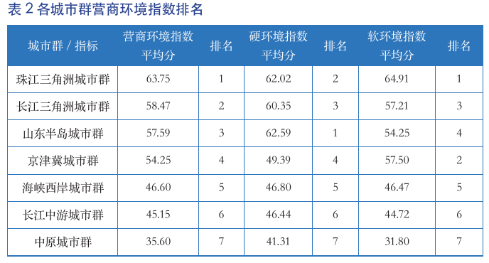 (四)珠三角城市群、长三角城市群营商环境指数排名最高