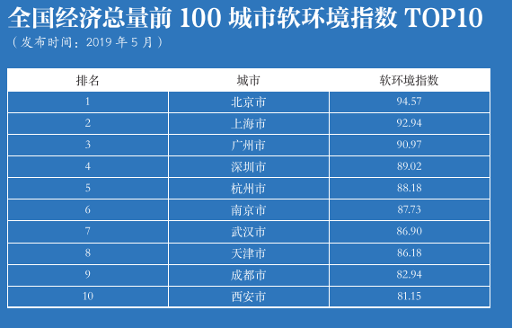 根据软环境指数评价结果,在中国经济规模排名前100的城市中,2019城市软环境指数排名前十的分别为北京、上海、广州、深圳、杭州、南京、武汉、天津、成都、西安。此次评价结果显示,软环境指数排名前十的城市与营商环境指数排名前十的城市高度一致,软环境成为决定城市营商环境竞争力的关键因素。