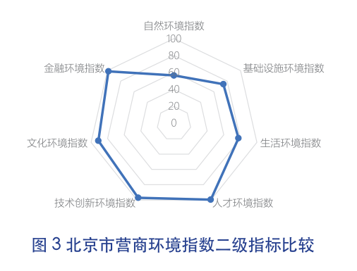 北京软环境指数排名居首,受自然环境影响,营商环境指数位列第二。北京城市营商环境指数总分为84.63分,其中软环境指数位居全国榜首。在金融环境、人才环境、技术创新环境、文化环境、生活环境等5个二级指标中,北京均排名前三,其中人才环境和金融环境优势最为明显,位列全国首位。在24项软环境三级指标中,北京的科研人才供给、政府文教投入力度、大学数量、学术文化、服务市场规模、技术成果储备等12项指标均位居首位。但受到空气质量、气候环境、森林覆盖率等自然环境的制约,北京硬环境指数排名较为靠后。