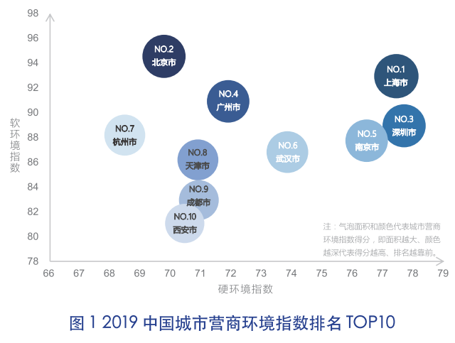 根据2019中国城市营商环境指数评价结果,排名前十的城市为上海、北京、深圳、广州、南京、武汉、杭州、天津、成都、西安。