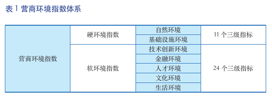 我们将营商环境指数评价体系的一级指标分为硬环境指数和软环境指数。其中,硬环境指数占营商环境指数的权重为40%,具体包括自然环境和基础设施环境2个二级指标,11个三级指标;软环境指数占营商环境指数的权重为60%,具体包括技术创新环境、人才环境、金融环境、文化环境和生活环境等5个二级指标,24个三级指标。