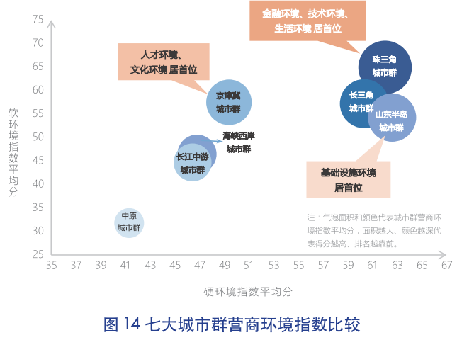 各个城市群营商环境的主要驱动因素存在差异。在七大城市群中,珠江三角洲坐拥沿海区位优势和广东省重要的金融资源和科技资源,金融环境、技术环境和生活环境均位列首位;山东半岛城市群具有良好的工业产业基础,综合交通网络较为发达,人均基础设施环境排名居首;而京津冀城市群则依托北京的辐射和带动作用,对于人才有着强大的虹吸效应,在文化交流、国际交往方面形成优势,人才环境和文化环境指标均列第一位。