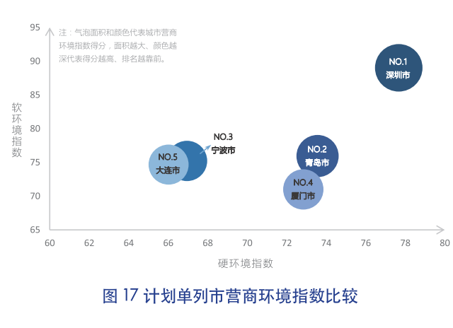 在五个计划单列市中,城市营商环境指数和软环境指数排名,深圳、青岛和宁波排名靠前,厦门、大连相对落后,其中,深圳的营商环境指数、软环境指数和硬环境指数均位列第一,二级指标中基础设施环境、人才环境、技术创新环境、文化环境、金融环境也位列首位。