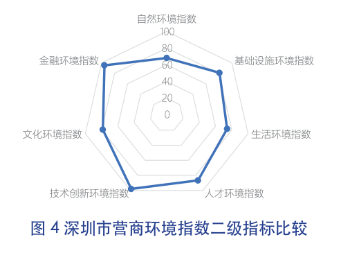 深圳硬环境指数位居第一,技术创新环境领跑全国。深圳城市营商环境指数总分为84.48分,其中硬环境指数排名第一,软环境指数排名第四。深圳在经济发展速度与环境质量改善两方面实现了良好的平衡,在全国GDP排名前20位的城市中,深圳的空气质量排名第一。深圳一直把创新驱动作为城市发展的主导战略,工程实验室、工程研究中心等各类创新机构数量、技术专利数量、科研支出等居全国前列,技术创新环境名列第一,其中技术人员数量位居全国第二,仅次于北京。但在人才环境方面,本地高等学校毕业生数量、大学数量等仍有可提升的空间。