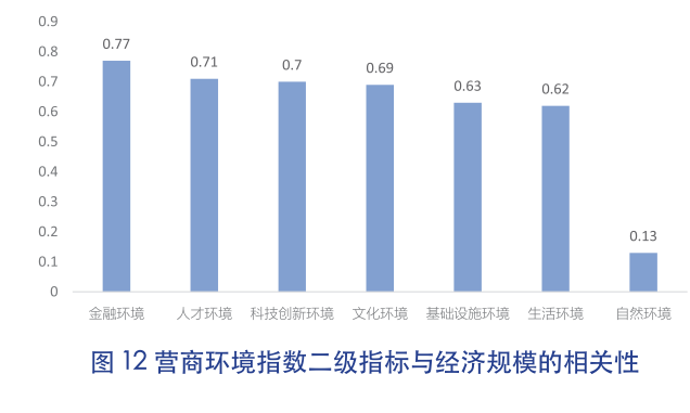 从城市营商环境指数7个二级指标来看,金融环境、人才环境、技术创新环境、文化环境、基础设施环境、生活环境、自然环境与经济规模的相关性分别为0.77、0.71、0.70、0.69、0.63、0.62和0.13,所有二级指标均与经济规模呈现正相关关系,其中金融环境相关性最高,人才环境、技术创新环境和文化环境仅次于金融环境,自然环境相关性最低。