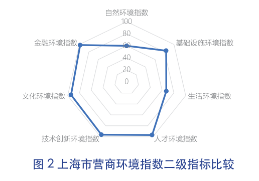 七成指标排名前五,助力上海夺魁。上海城市营商环境指数总分为86.73分,其中软环境指数和硬环境指数均排名第二,基础设施环境、人才环境、技术创新环境、文化环境和金融环境等5个二级指标均进入前三,其中基础设施环境和文化环境排名第一。在35个三级指标中,高端人才供给、政府文教投入力度、外资吸引力、直接融资、间接融资、消费市场规模等18个指标均列全国前三,有近七成的指标位列全国前五,其软硬环境的综合优势明显。