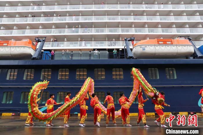 欢腾的舞龙舞狮欢迎“迈希夫”号邮轮到访上海吴淞口国际邮轮港。蒋小威摄