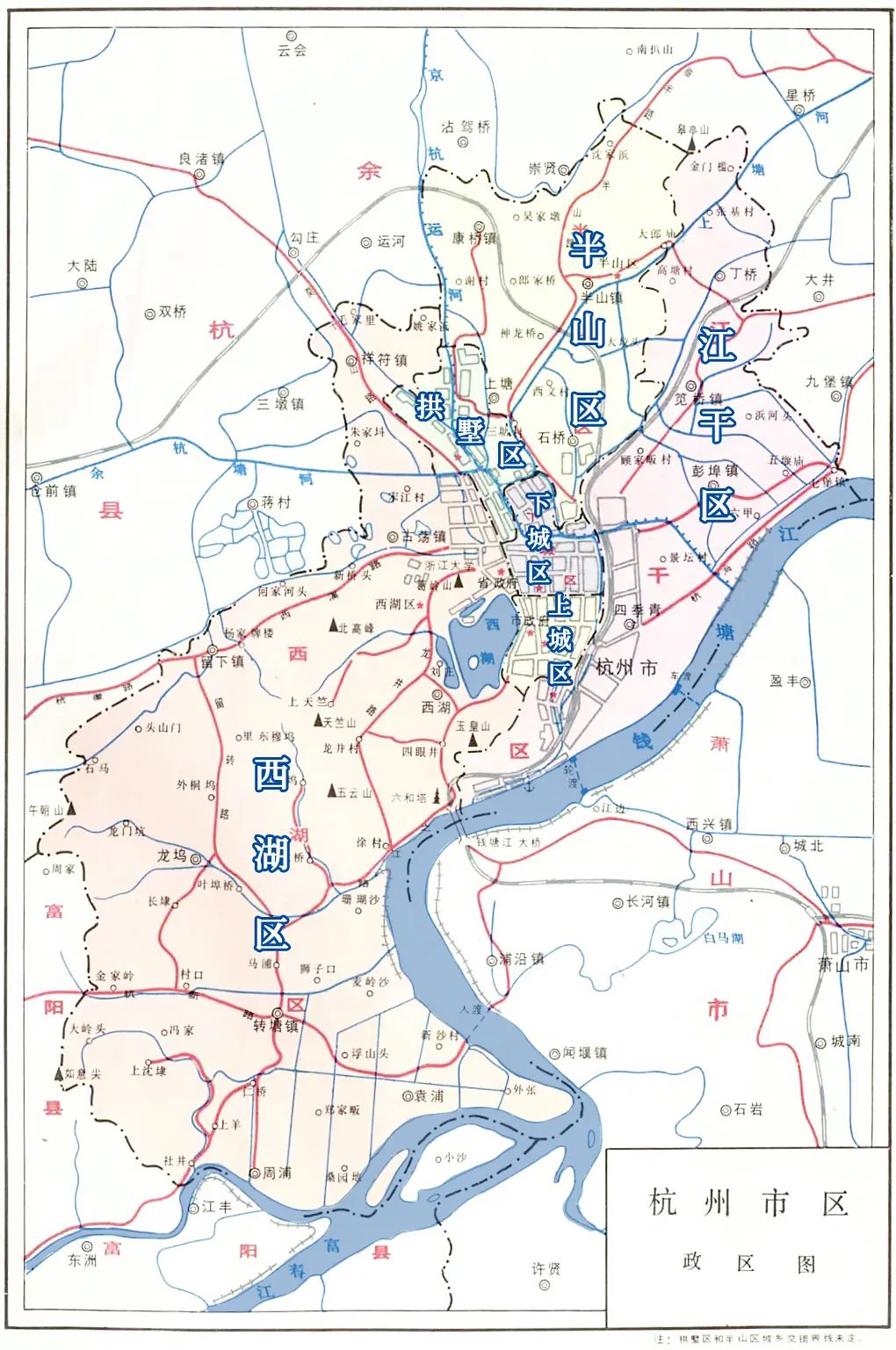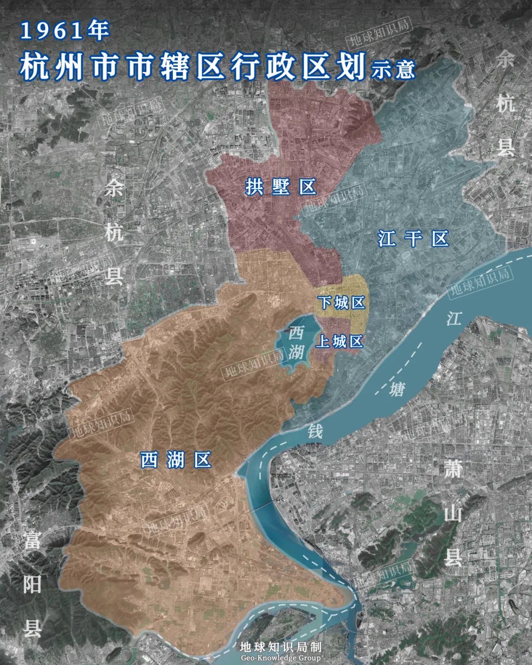 1961年,杭州的行政区划有一次重大变动,全市缩减为五个区,上城、下城、西湖、拱墅、江干。此后延续了三十多年,构成了大多数老杭州人熟知的家乡格局。