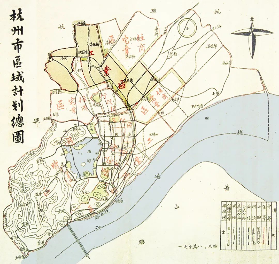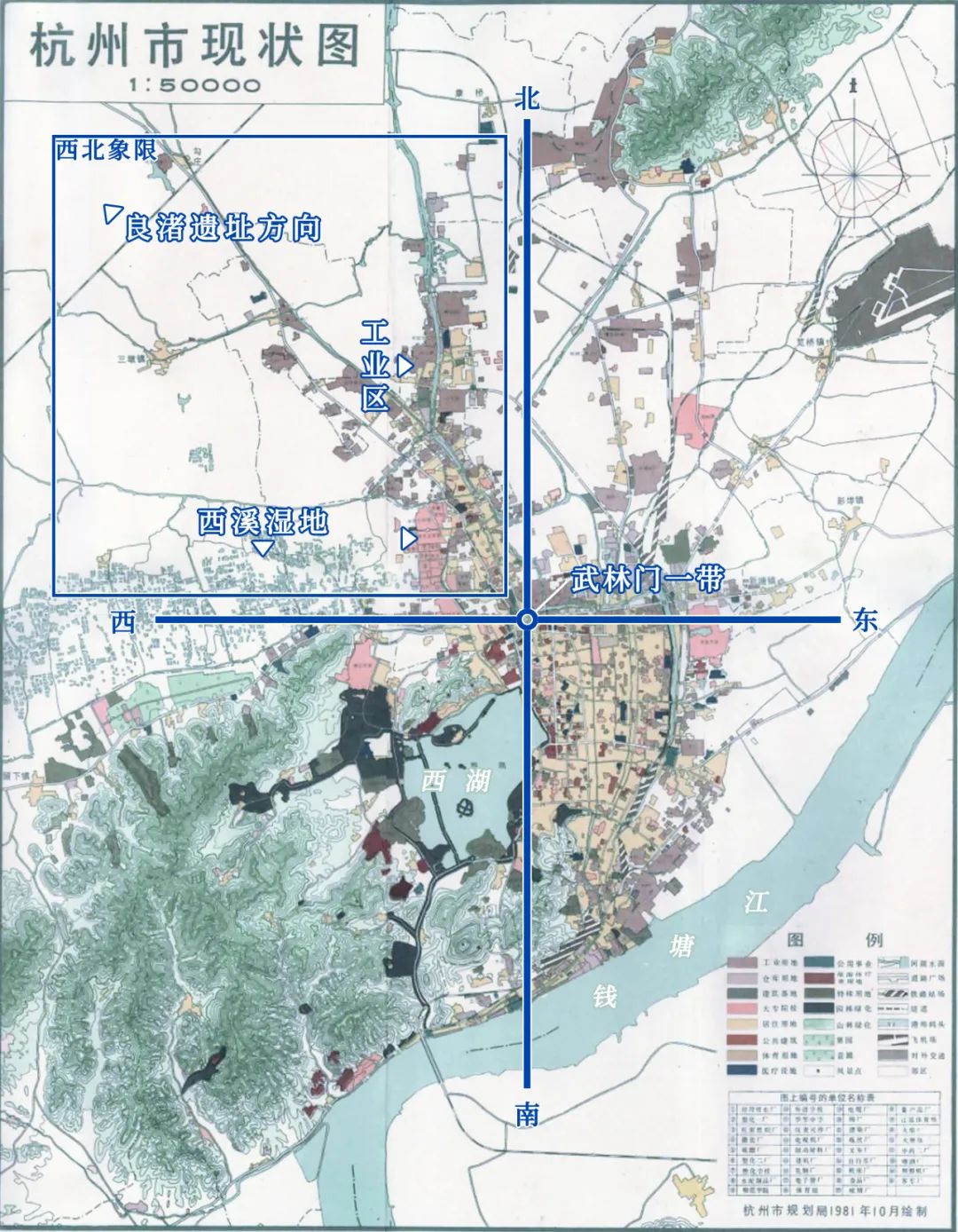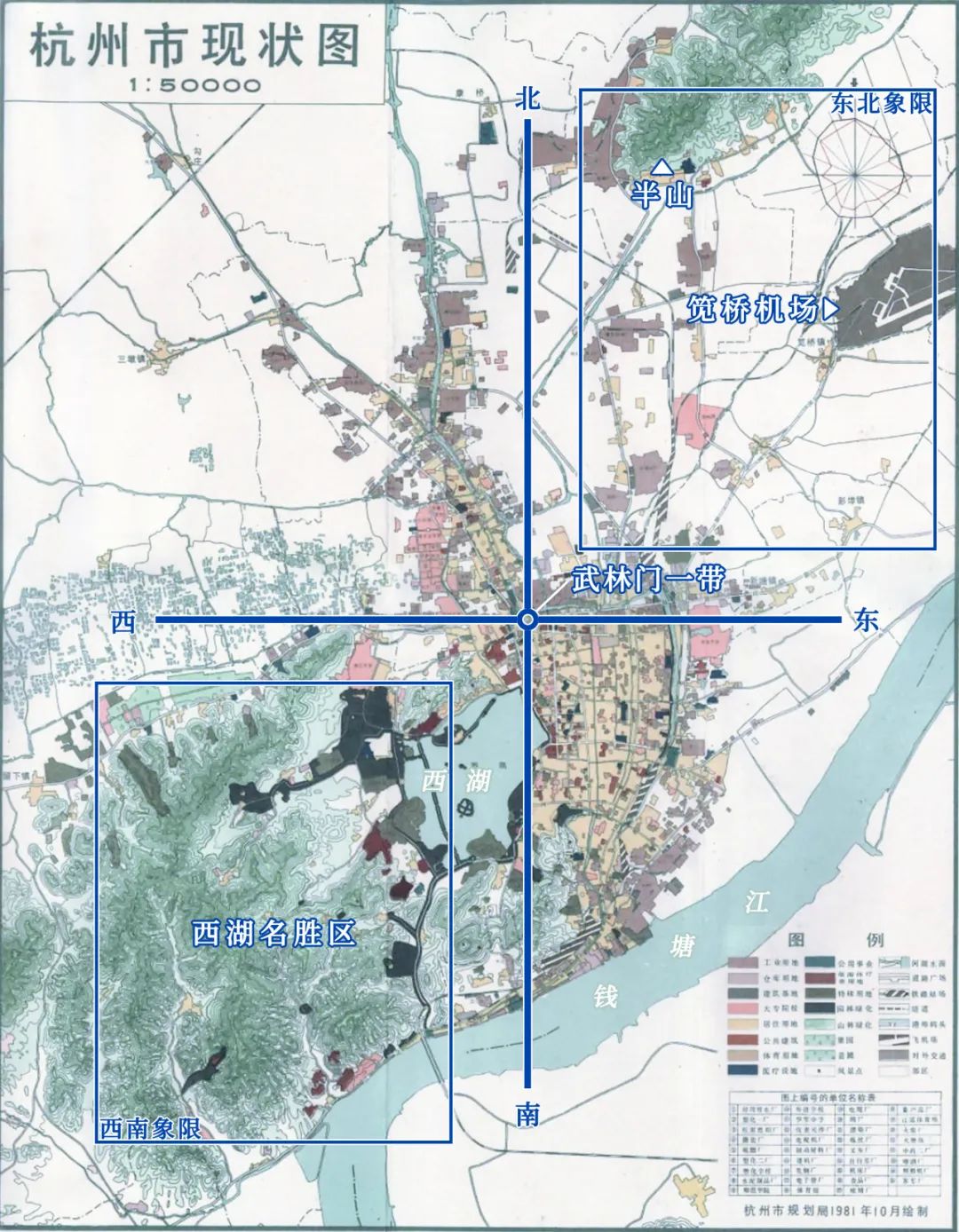 因为此时城区扩张的主要方向是西北,上世纪的杭州城区地图都是竖版的,城区的范围是一个从老城向西北方向延伸的“弯月形”。