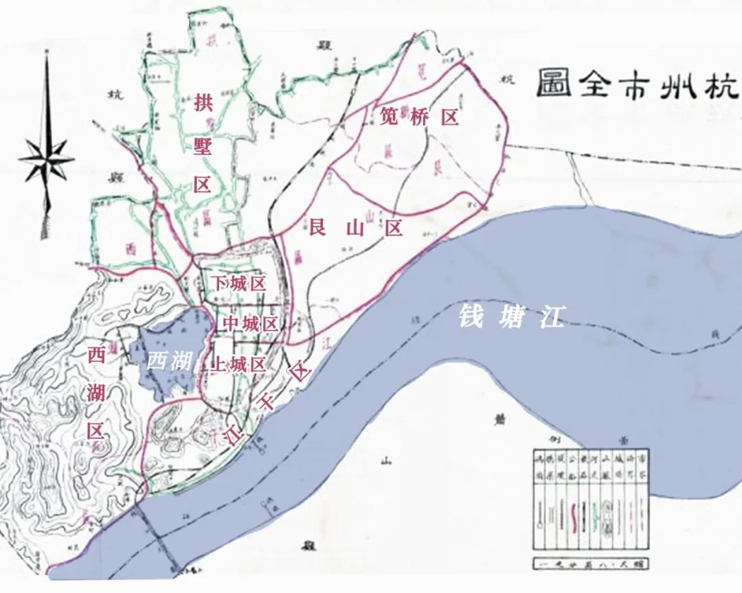 解放后的1949年,杭州设立了八个行政区,包括老城内的上城、中城、下城,以及郊外的西湖、拱墅、江干、艮山、笕桥,后来又多次调整。那时期许多短暂的区名,现在恐怕只有70岁以上的老人才有印象了。