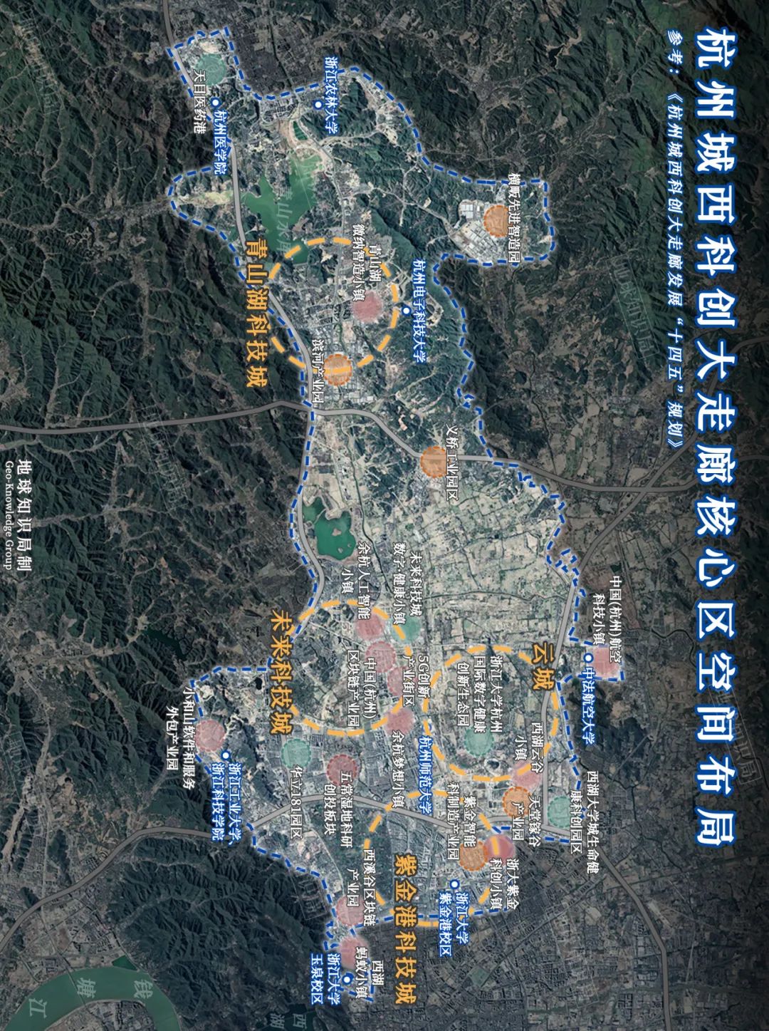 2020年左右,一条东起浙江大学,西到临安青山湖的“城西科创大走廊”逐渐成型,下辖紫金港科技城、未来科技城、青山湖科技城、云城、云栖小镇,总面积约416平方公里,包含十余万家企业(大多为新兴产业公司),被称为“浙江最具创新活力之地”。