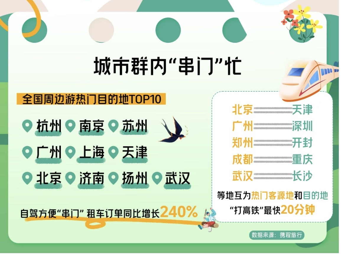 杭州-上海,北京-天津,广州-深圳,郑州-开封,成都-重庆,济南-青岛,武汉-长沙等地互为假期热门客源地和目的地,“打高铁”最快仅需20分钟就能完成城市群内的“串门”,让这些城市的旅客能够在小长假享受双城生活的快乐。