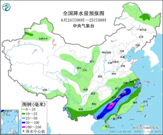 6月23日08时至24日08时,浙江大部、安徽南部、江西东部和南部、福建西部、广东中北部、广西东部和南部、云南中东部和西北部等地的部分地区有大到暴雨,其中,浙江中西部、江西东北部、福建西北部、湖南南部、广西东北部、广东北部等地部分地区有大暴雨(100~180毫米)。内蒙古中西部、辽宁南部和西部、新疆南疆盆地、河北中南部等地部分地区有4~6级风(见图3)。