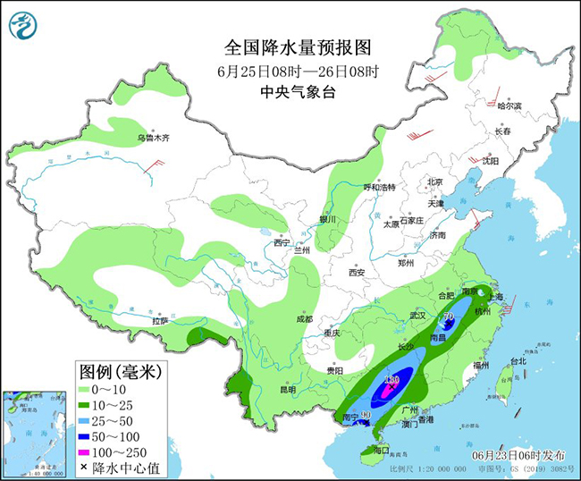 6月25日08时至26日08时,江南北部和西南部、云南西部、华南中西部等地部分地区有中到大雨,其中,湖南南部、江西北部、广西东北部和南部沿海、广东北部等地部分地区有暴雨或大暴雨(100~130毫米)。内蒙古中东部、黑龙江西部、辽宁中部、新疆南疆盆地等地部分地区有4~6级风(见图5)。