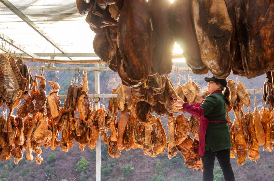 图1:晒腊肉,图2:捏制血粑粑(血豆腐)。