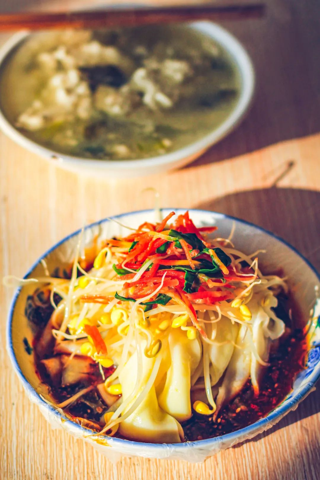 汉中热面皮,要搭配浆水菜豆腐;安康蒸面,以芝麻酱调味最地道;等到了山地众多的商洛,则有了以杂粮粉条为馅料的水煎包配上豆浆或者稀糊汤。此外,还有核桃馍、炕炕馍、花圈馍等众多面点,厚重扎实中带着几分灵巧。