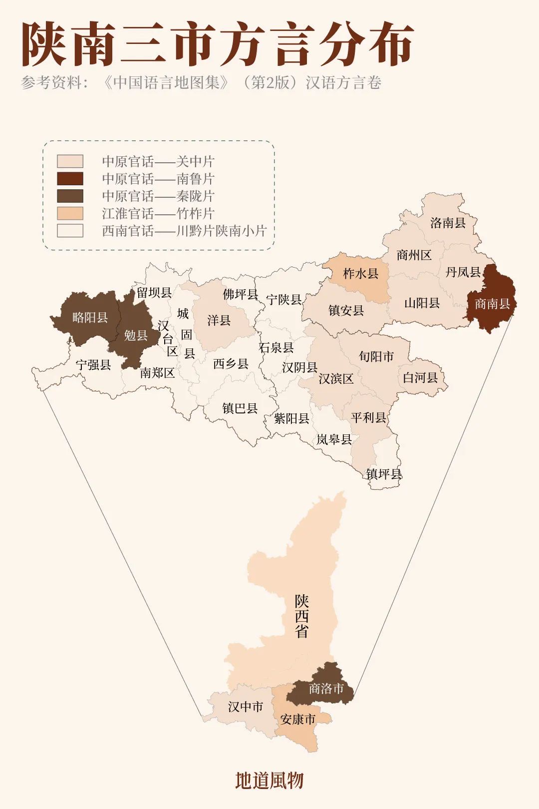 陕南人的画风,就更多元了。西南官话是陕南人乡音的基底,但汉中西北和甘肃老乡无缝对接,商洛北边则大都操着一口关中腔,等到了安康、商洛南部,你还会遇到说江淮官话、湘赣方言甚至广东话与“地瓜腔”的老乡……乃至于在陕南,用普通话进行交流可能才是最佳解决方案。