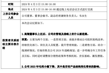 回复:主要为两个方面,一是管理方面,承接并推动公司组织架构改革,持续优化部门、岗位及人员配置,提升管理效能;二是销售方面,结合一线调研情况、市场形势及公司2024年战略规划,进一步明确全年工作任务及目标,同时适时调整部分销售政策和考核机制,夯实基础、激发潜能。