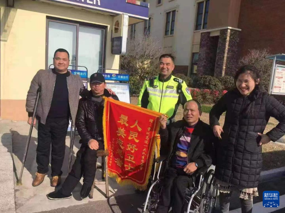 江苏省常州市公安局交警支队高速公路一大队一级警长李忠(右二)生前的工作照(资料照片)。新华社发