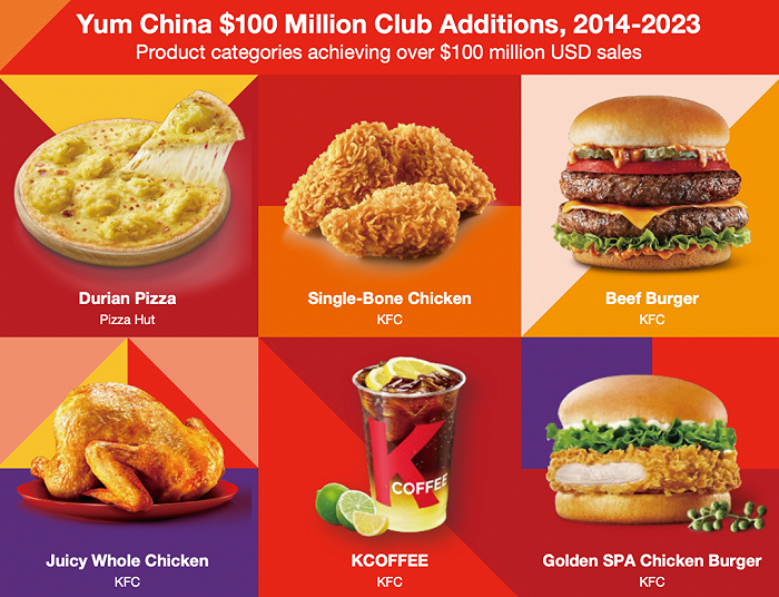 根据屈翠容的总结,2023年百胜中国推出超过500款全新或升级产品。“我们的‘1亿美元俱乐部’(即销售总额超过1亿美元的品类)在壮大。近年来推出的牛肉汉堡和秘汁全鸡,在2023年共计为肯德基贡献近6%销售额,超过了经典的“吮指原味鸡”。”屈翠容说。