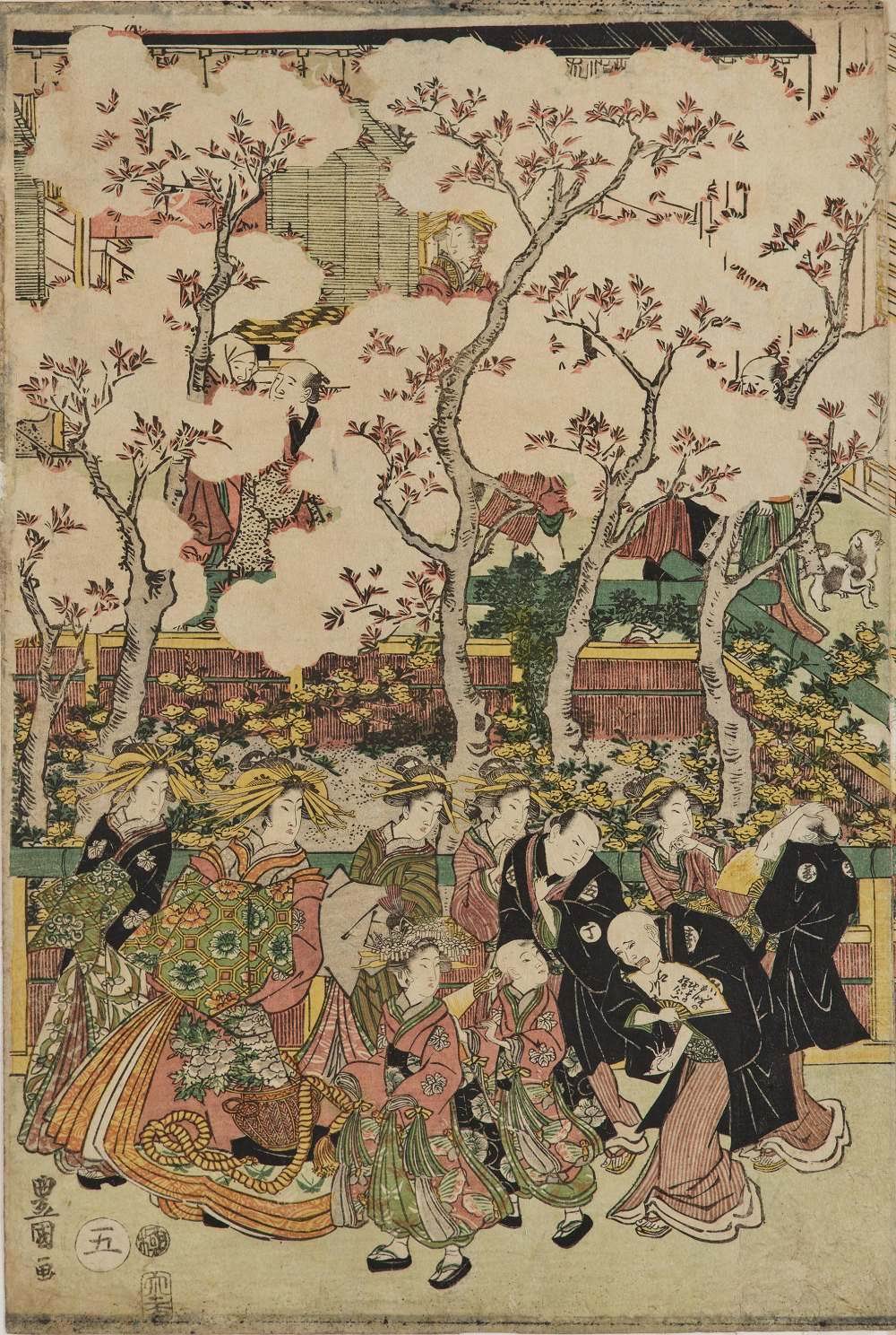在博物馆各个展厅中呈现与樱花相关的展品。除了浮世绘名家歌川丰国等人的画作,还有与樱花相关的瓷器、织物、屏风等器物。展出的画作包括歌川丰国的《新吉原樱花之景》、狩野永岳的《舞乐图屏风》、奥村政信的《樱花下骑马的少年》等。