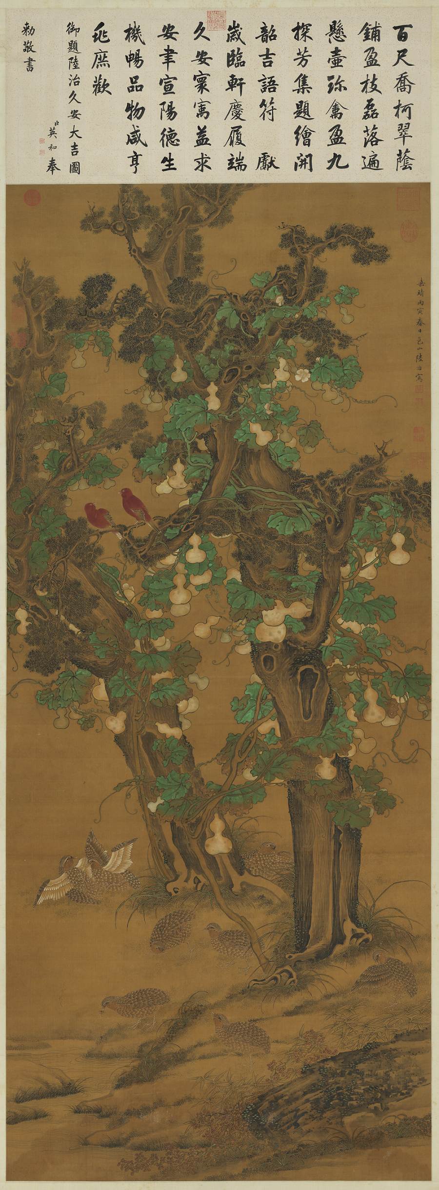 巨幅名作”是台北故宫博物院不定期举办的专题展览,每次选取数件馆藏大尺幅书画名品进行展示。本期展品一共5件,包括明陆治《久安大吉图》、清刘九德《画狻猊》、郎世宁《画十骏犬霜花鹞》、陈兆凤《博古花草》,以及一件唐代写本《大般涅槃经卷第卌一》。展期从3月28日持续至6月25日。