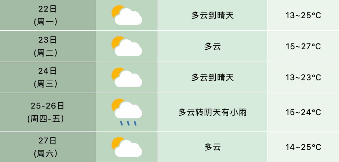 22日(周一):江北晴天到多云;江南多云有时阴天,部分地区有小雨。