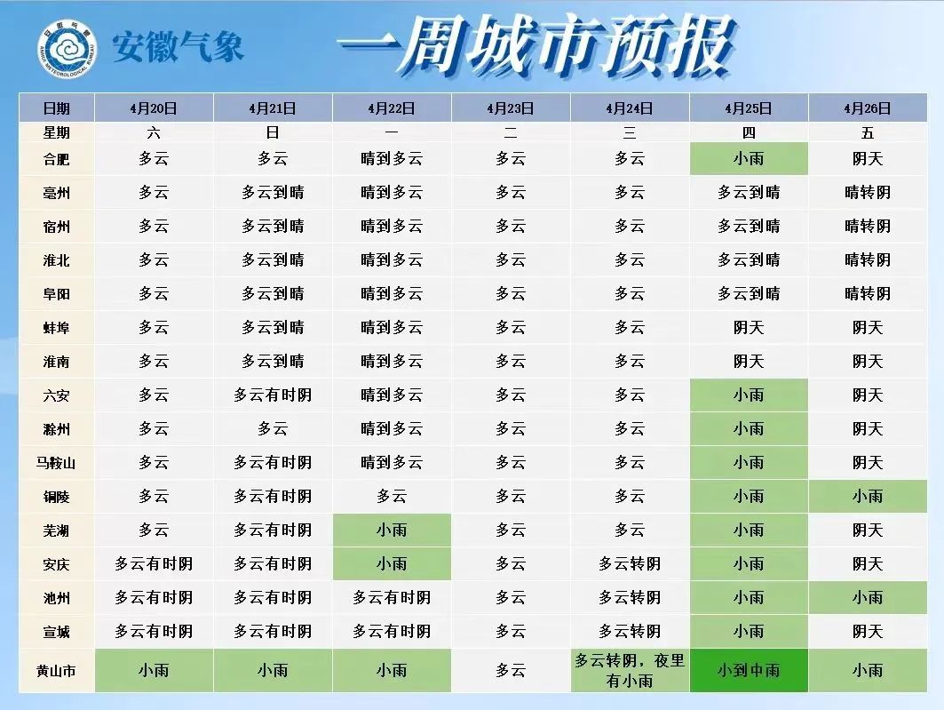 25日(周四):淮北地区多云到晴天;淮河以南阴天,大部分地区有小雨,其中江南部分地区中雨。