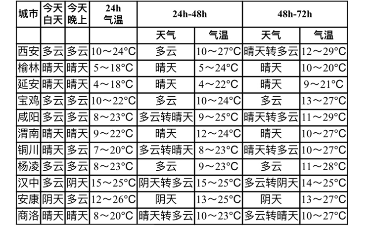 陕西主要城市天气预报。