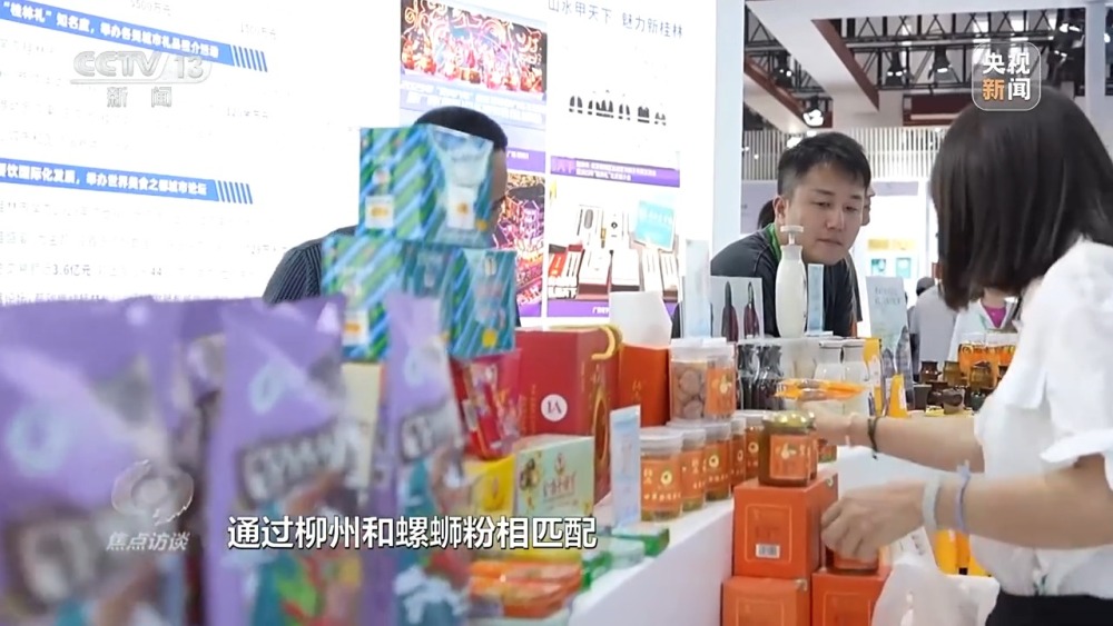 广西壮族自治区商务厅工作人员 李春颖:往年我们都是桂茶、桂酒、桂艺,我们这一次想增加城市烙印,就选择了六个区域消费培育试点城市,让城市跟物品相挂钩。我们通过柳州和螺蛳粉相匹配,桂林和桂林有名的文创相匹配。展会可能是一个星期、一个时间段,通过展会引导消费者来到我们的城市,感受消费,全年消费。