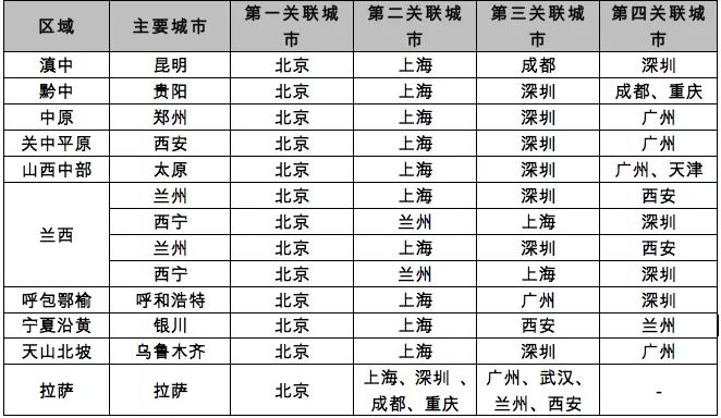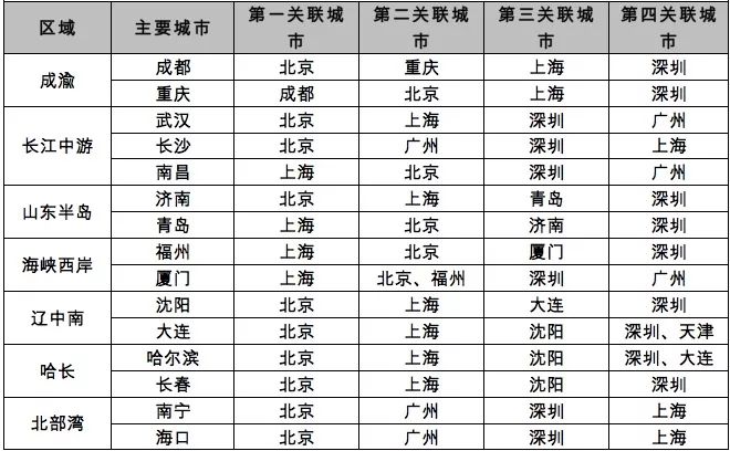 另外,重庆的第一关联城市成都,而成都的第一关联城市则是北京,这在一定程度上表明,重庆对成都的依赖度,大于成都对重庆的依赖度。另外,成都、重庆在贵州、云南、西藏等地区均有一定的存在感。
