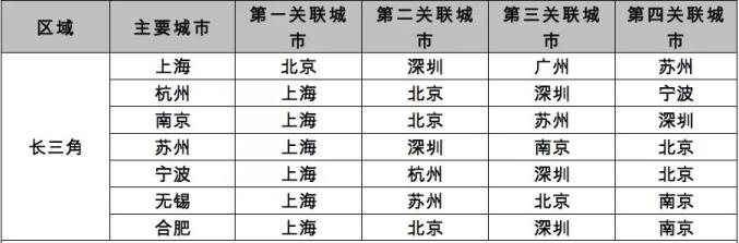 重点看看这些城市的“第二关联城市”,北京出现了三次,深圳出现了两次,苏州与杭州各出现一次。再看第二、第三、第四关联城市中,北京与深圳几乎全部出场,这表明北京与深圳在长三角地区颇有存在感。