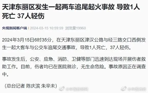 2024年3月15日6时35分,天津市东丽区津汉公路与经三路交口西侧发生一起大客车与公交车追尾交通事故,两车起火燃烧。事故发生后,公安、应急、消防、卫健等部门迅速到达现场开展伤者救助工作。此次事故导致1人死亡,37人轻伤。