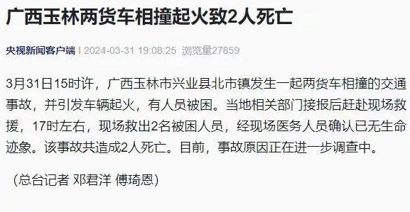 2024年3月31日15时许,玉林市兴业县北市镇发生一起两货车相撞的交通事故,并引发车辆起火,有人员被困。当地相关部门接报后赶赴现场救援,17时左右,现场救出2名被困人员,经现场医务人员确认已无生命迹象。该事故共造成2人死亡。