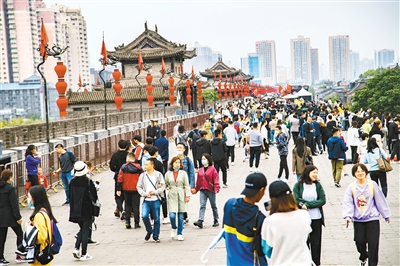 游客在西安城墙参观游览。 (首席记者 李明 摄)