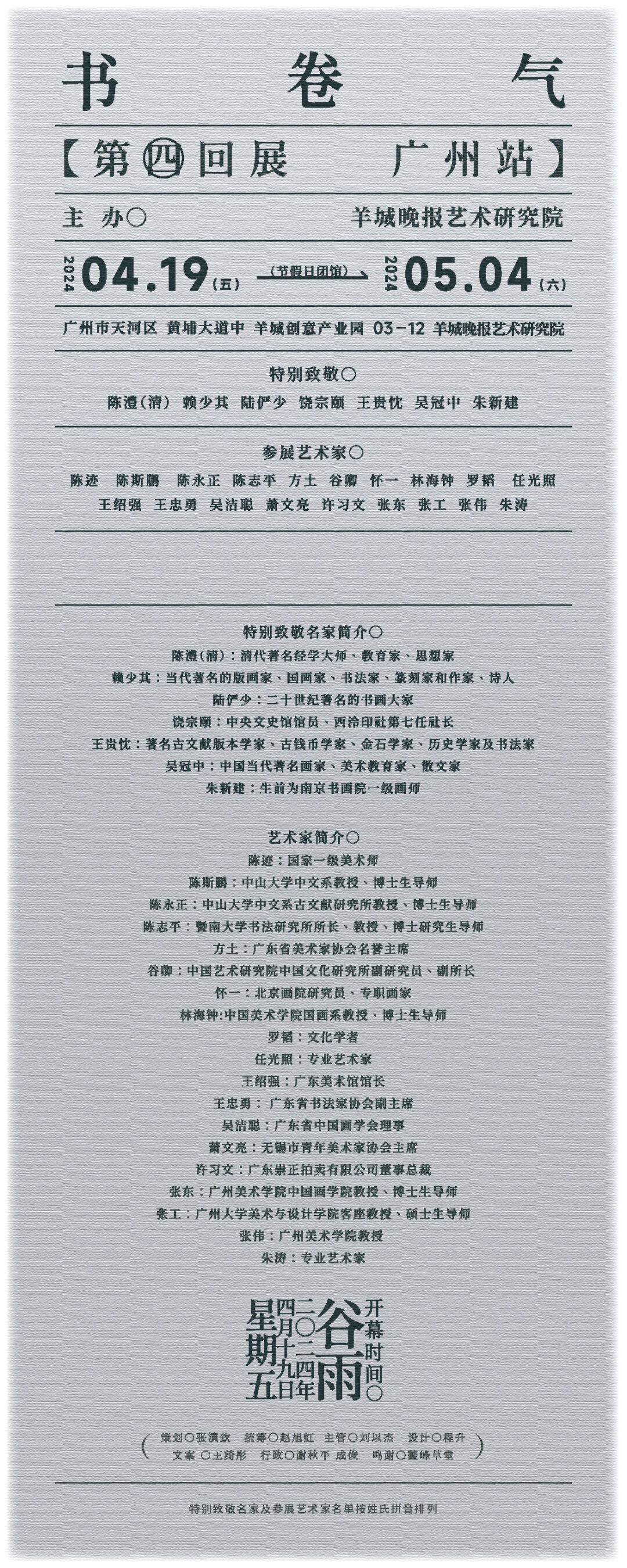 “雨生百谷”,甲辰龙年谷雨时节,将拉开书卷气第四回展的帷幕,参展的作者不仅有专业的画家、书家,还有学者、文化人,同时还展出陈澧、赖少其、陆俨少、饶宗颐、王贵忱、吴冠中、朱新建等名家大师的作品,一起呈现书卷气的丰盈内核与丰富面相。