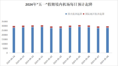根据境内机场每日起降架次计算,接近假期时起降架次开始增长,假期中间的5月2日、5月3日有所下降,之后再次增长,假期结束后起降架次逐步回落。假期最后一天的5月5日是起降最高峰,境内机场共起降31010架次。