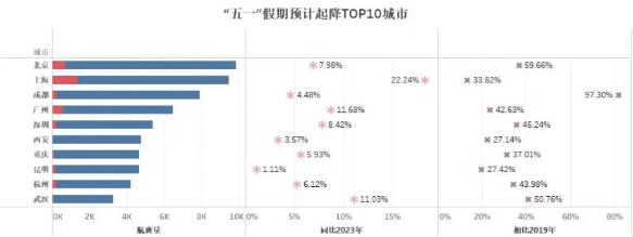 根据分析,今年“五一”假期境内机场日均起降3万架次,预计会成为史上最忙“五一”;全国39个城市航班起降超1000架次,六成以上城市起降超2019年同期;19家航司航班量超1000架次,东航航班量排名第一;国内京沪航线最繁忙,国际及地区航线TOP10上海占6条。
