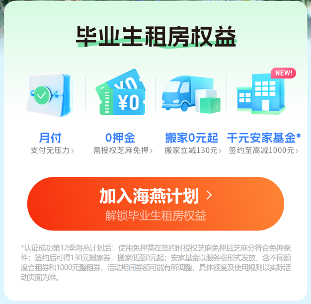 自如海燕计划第12季再次加码千元安家基金 ,为毕业生送上亿元租房支持据了解,应届毕业生可通过自如APP、小程序等平台,提交院校信息后便可认证海燕计划,0押金便可实现“拎包入住”,同时总计千元的安家基金会以租房券的形式发放至用户账户,在签约时,通过第三方信用认证,0押金权益将会自动带出,同时支付时可用安家基金抵扣相应金额,整个过程流程便捷。