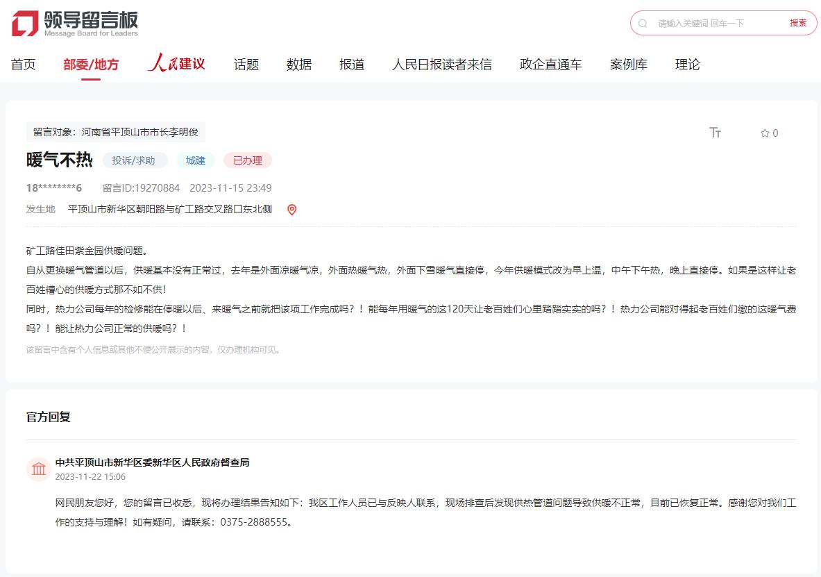 接到留言后,平顶山市新华区委、新华区人民政府督查局工作人员与反映人联系并核实情况。相关部门工作人员在现场排查后发现该小区供热管道出现了问题,并对该小区供热管道进行检修,检修后该小区暖气已恢复正常。【留言详情】