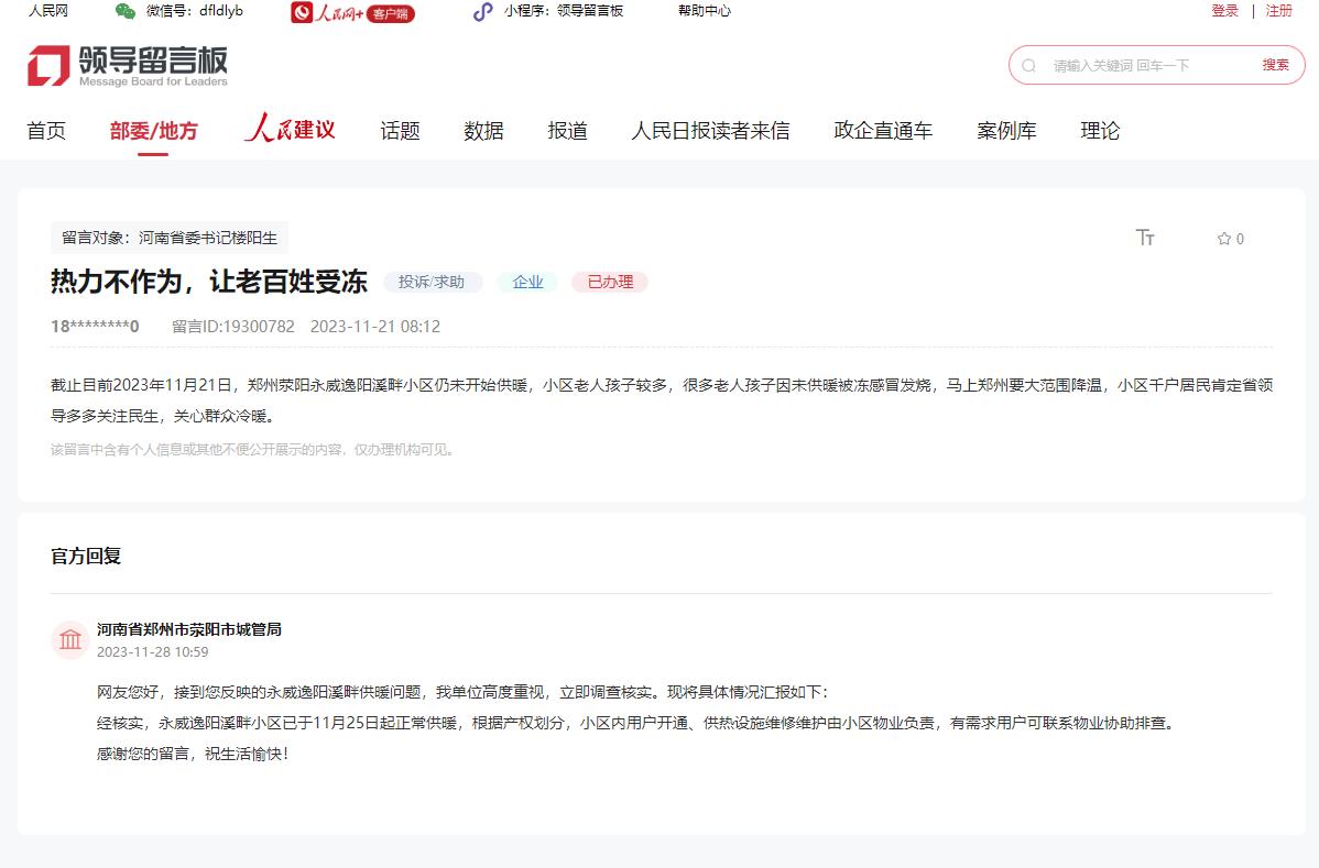 回复中称,永威逸阳溪畔小区已于11月25日起正常供暖,根据产权划分,小区内用户开通、供热设施维修维护由小区物业负责,有需求用户可联系物业协助排查。【留言详情】