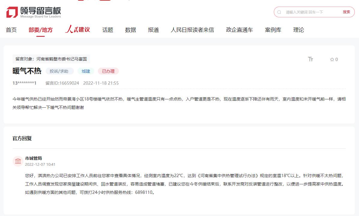 12月7日,鹤壁市淇滨热力公司安排工作人员前往网民家中测量室温,该网民家中的温度已达22℃。【留言详情】