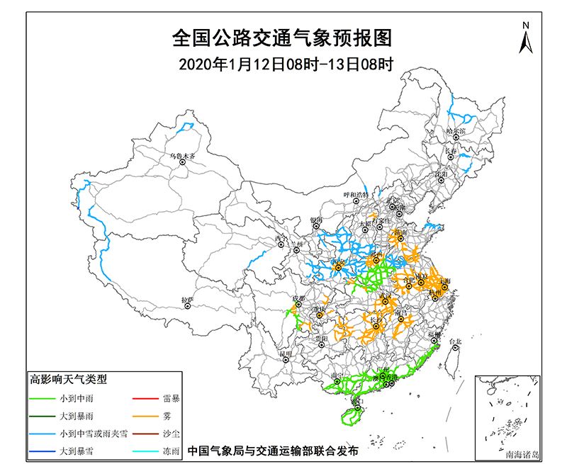图3 全国公路气象预报图(1月12日08时至13日08时)