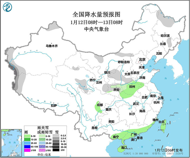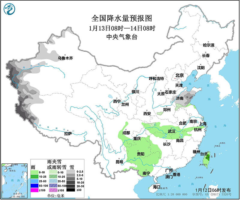 图1 全国降水量预报图(1月12日08时-13日08时)